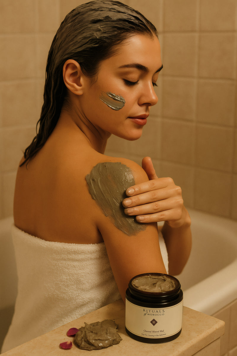 Rinse and scrub with the glove to remove dead skin. - Ghassoul – Detox: Apply the clay mask to face & body. Leave for 10 minutes, rinse off.